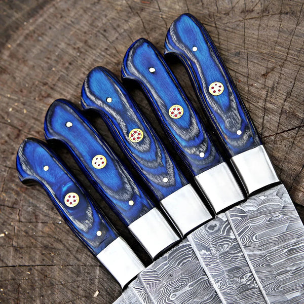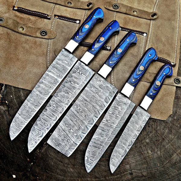 Custom Handmade Damascus Steel 5 Pcs Chef Set Handle Rosewood With Leather Kit